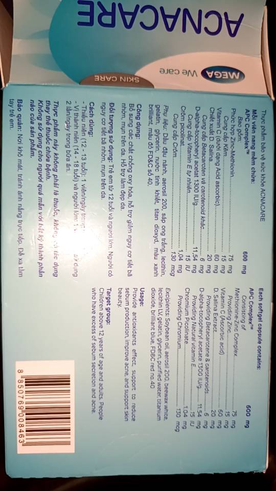 Viên uống trị mụn acnacare là sản phẩm viên uống bổ sung các dưỡng chất cần thiết cho da nhằm ngăn ngừa và hỗ trợ điều trị các vấn đề về mụn. Sản phẩm có xuất xứ từ Thái Lan, sản xuất và phân phối bởi công ty Mega Lifesciences LTD, đã nhận được chứng nhận tiêu chuẩn của Cục An toàn Vệ sinh Thực phẩm và Bộ Y Tế. Acnacare thuộc nhóm thực phẩm bảo vệ sức khỏe, không có tác dụng thay thế thuốc chữa bệnh.